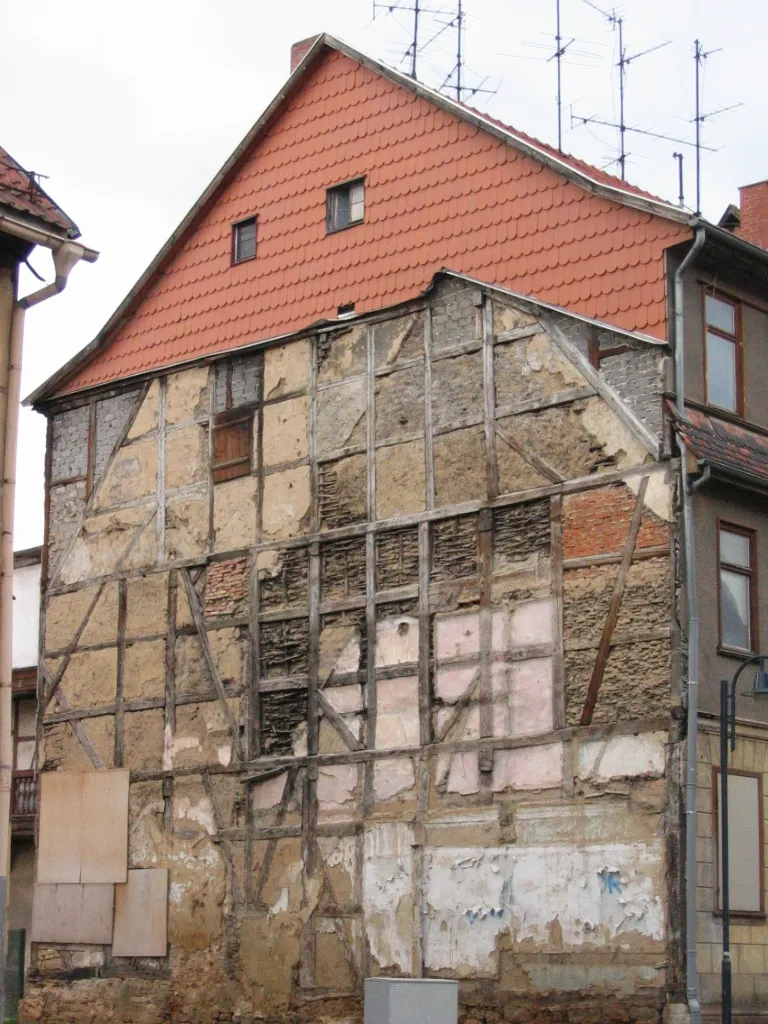 Bildnachweis: „Naked timber framing in Mühlhausen Thüringen.jpg“ von Scott Moore, lizenziert unter CC BY 2.0.